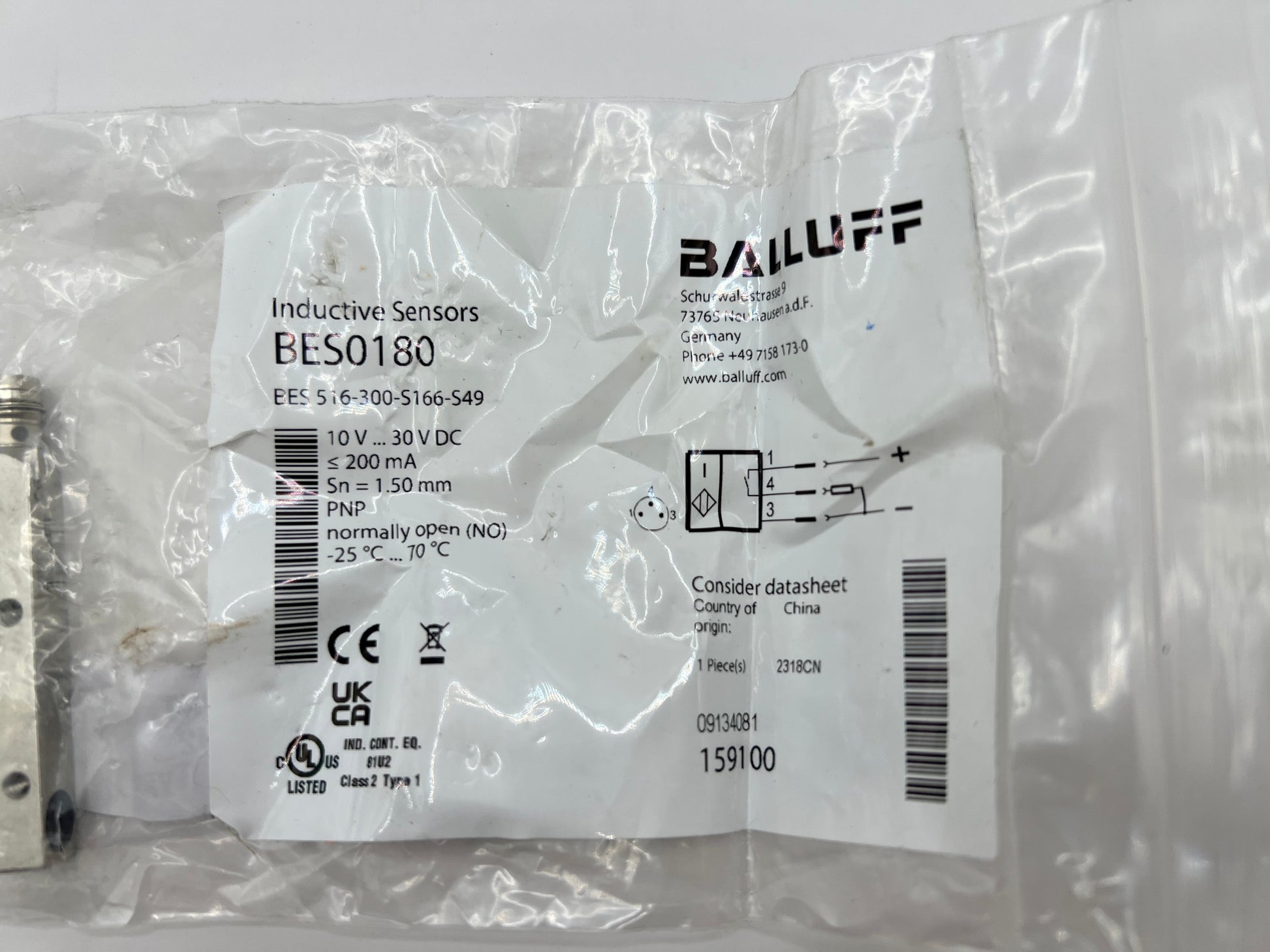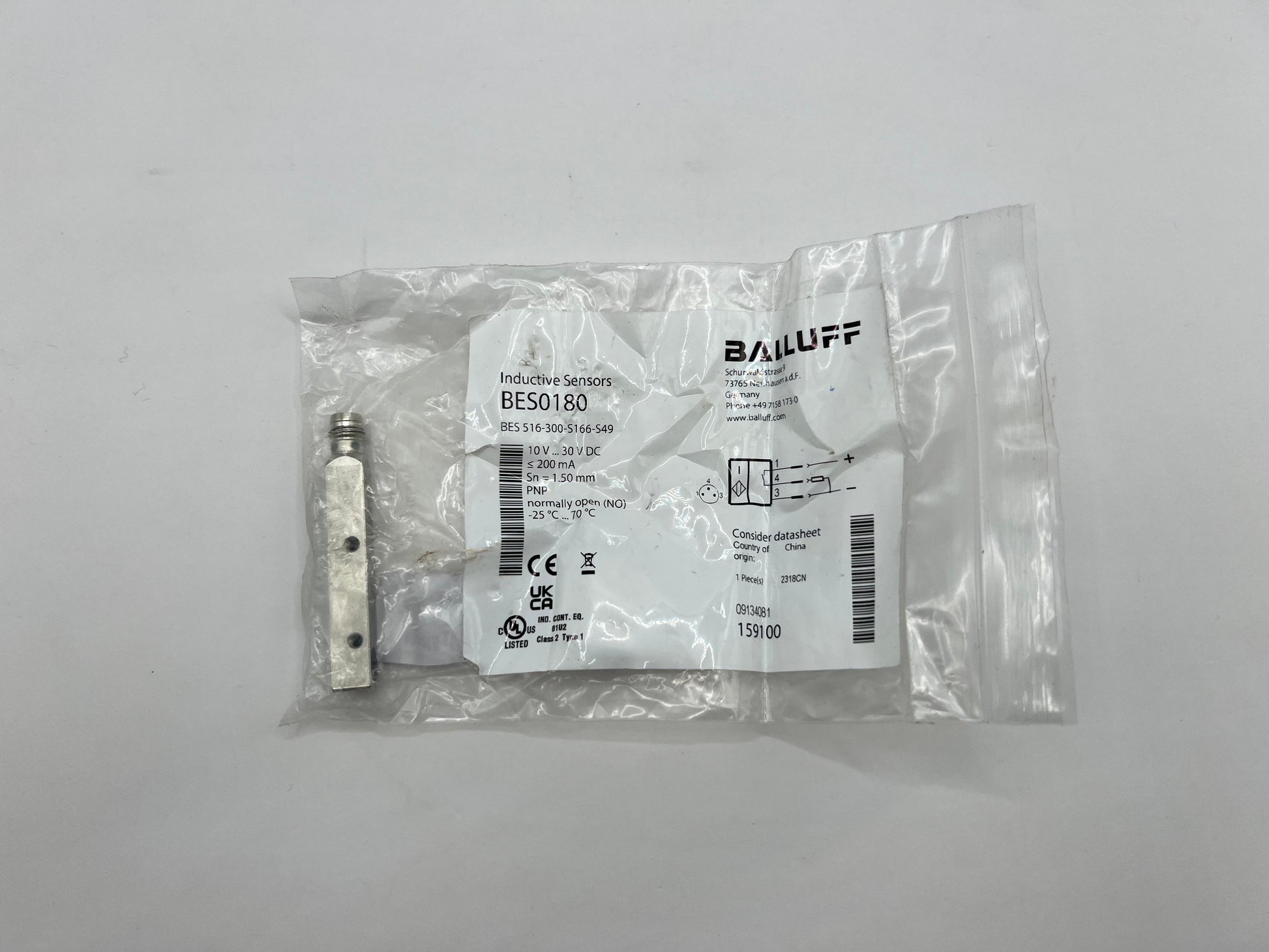 Balluff BES0180 (BES-516-300-S166-S49) Inductive Proximity Sensor in original packaging. This high-quality sensor is designed for precise, non-contact detection of metallic objects, offering exceptional reliability and durability in industrial environments.