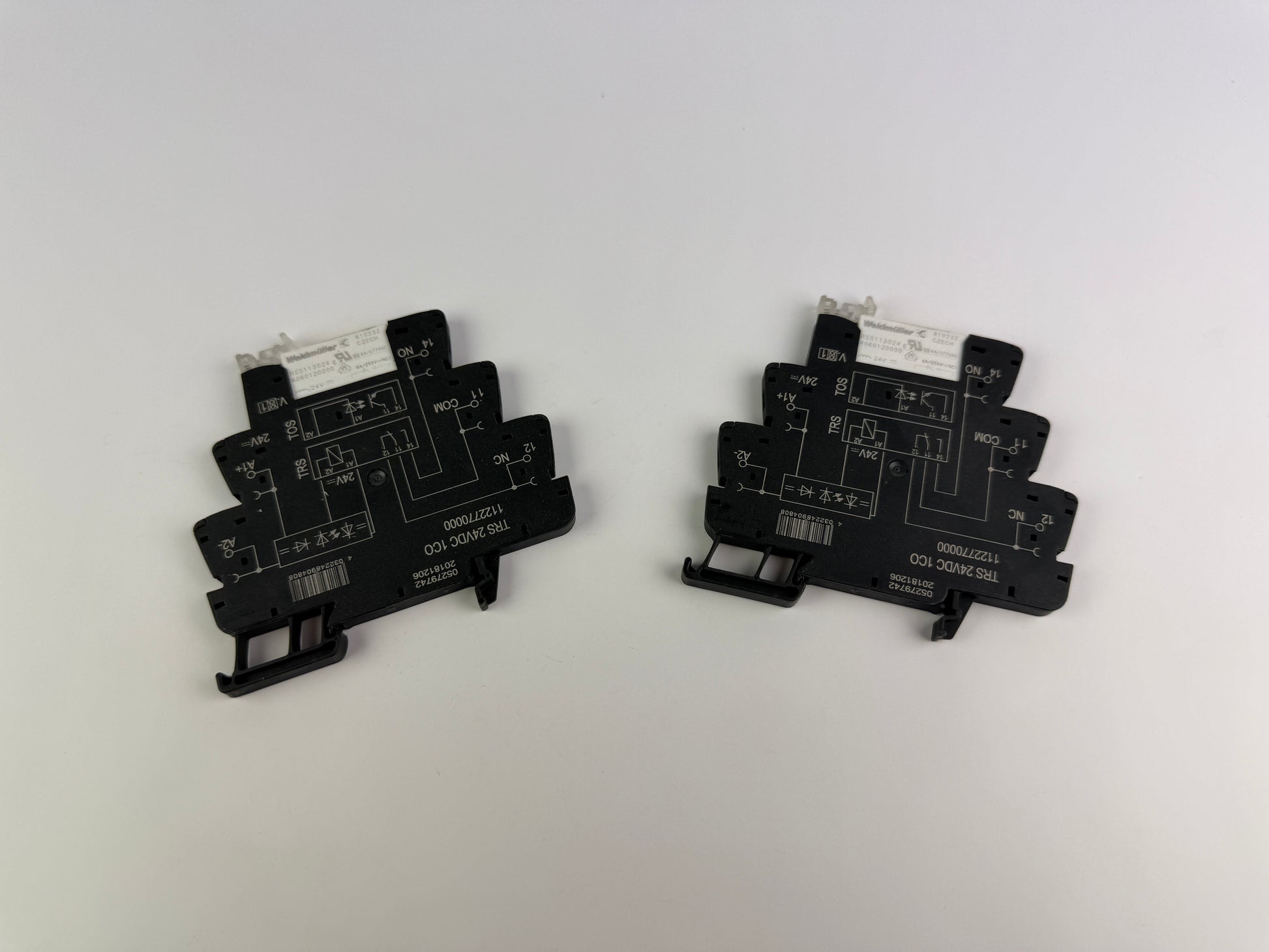 Set of two Weidmüller 1122770000 TRS relays designed for reliable switching in industrial automation and control systems.